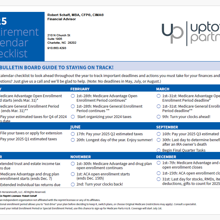 Use this calendar checklist to look ahead throughout the year to track important deadlines and actions you must take for your finances and health care. (Note: No deadlines in May, July, or August.) Questions? Just give us a call and we’ll be glad to help. 2025 Retirement Checklist- Download Here